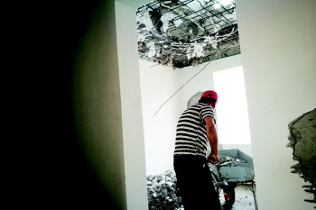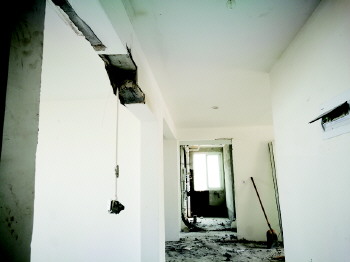 在另外一处房屋,记者看到刚进门的玄关处,左侧楼顶承重墙下面的部分泡沫砖已脱落,耷拉着一根电线和开关。20楼和21楼之间,同样位置处的楼板也已经被凿空,一工人正在20楼清理刚凿下来的建筑垃圾。