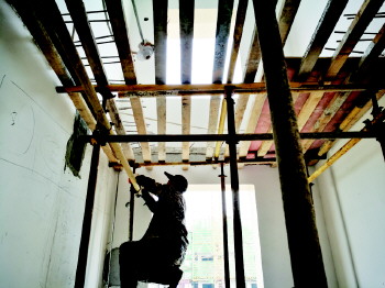 工人们搭起脚手架准备重新建房顶。