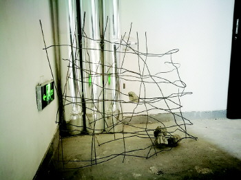 楼梯角落处放着刚拆下来的钢筋。