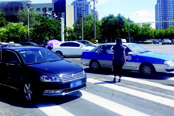 记者注意到,在有信号灯的路口,车辆和行人按信号灯通行,较少有“抢行”,而在没有信号灯的路口,车辆跟行人抢路的行为则更为严重一些。记者在大渡河路、金辰路以及胶州路部分路段没有信号灯的小路口看到,“人让车”成了最常见的情况。