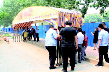 执法人员查扣仍在使用的露天棚架。 本报记者 段学虎 摄