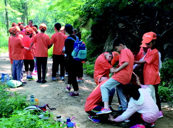 随后,今天最艰苦的训练开始了,徒步至百丈崖瀑布后,乘车下山。从观云台宾馆至百丈崖瀑布有近六公里远,小营员们坚持着走了下来,一路上偶有小营员喊辛苦,但却没有停下脚步,一步一步跟着队伍前进。为了鼓舞士气,大家还唱起了歌,响亮而稚嫩的歌声引得乘车路过的游客竖起了大拇指。