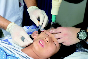 合德医院医生为刘欣雨放血治疗。 本报记者 任小杰 摄