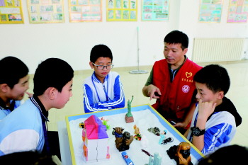 围坐在沙盘周围,朱清林与学生们一起讨论。