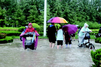16日下午,一场急雨过后,东营城区部分路段积水严重,市民冒雨前行。 本报记者 任小杰 摄影报道