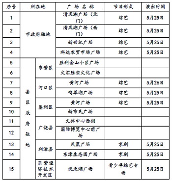 本报5月22日讯(记者 解岩) 为丰富和活跃群众文化生活,推动创建国家公共文化服务体系示范区工作顺利开展,东营市市、县、乡三级中心广场将于5月25日晚上7:30同时举办“欢乐黄河口”广场群众文艺演出,欢迎广大市民届时观看。如因天气原因调整,以现场安排为准。